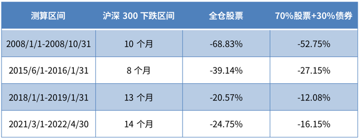 回测过去4次典型的单边下跌行情,最短为8个月,最长的一次持续了14个月。若在此期间均做好了股债搭配,账户浮亏会明显低于全仓投资沪深300指数的亏损,能一定程度上提升我们的投资体验。