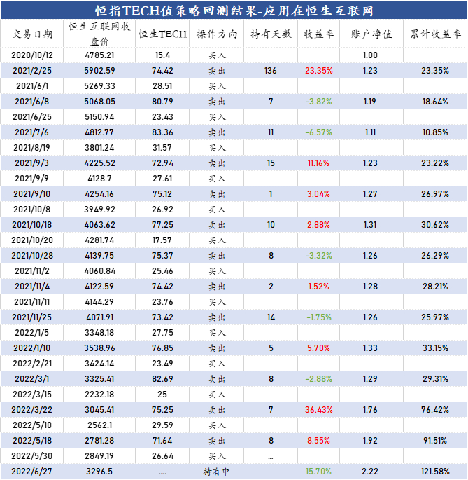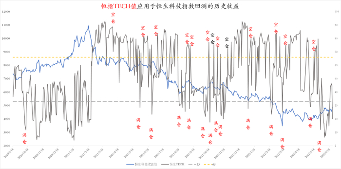 恒生TECH的取值在0-100之间,指标低于33时,触发进攻信号,给出了恒生科技指数的满仓信号,指标高于66时,触发防御信号触发恒生科技指数的空仓信号。