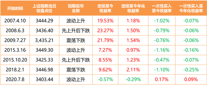 可以看出,除了2020年7月8日开始的定投,由于时间较短,定投成本均摊不充分,同时受到了近期市场震荡下行的影响,出现了负收益。其他不同时期的“3400点”开始的定投,至今都取得了不错的收益,并且都比在“3400点”一次性买入的收益高。