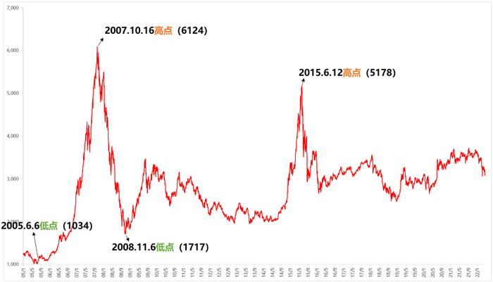 先来看一下近15年上证指数走势图。可以看出,随着中国经济发展的不断变化,A股也随之跌宕起伏。而上证指数出现3400点的区间主要在2007年和2015年的两次大牛市、2017年和2018年市场震荡反弹以及2020年市场反弹后。