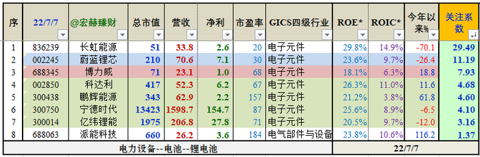 初选2:固定财务指标剔除:从毛利率、净利率,总资产周转率,净债务率,应收账款/营收,净利润含金量、现金周期、以及进一步提升ROE和ROIC标准等固定量化指标,剔除非常态公司,胜出公司【8】家。按照宏赫关注系数排序如下: