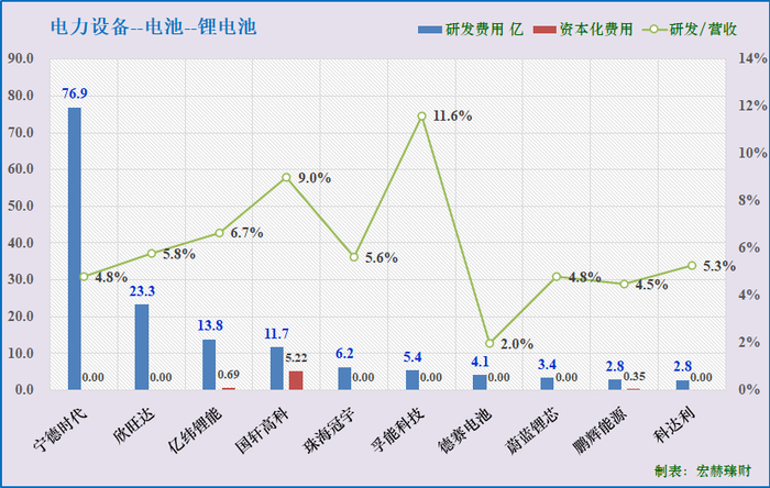 研发投入三甲:宁德时代76.9亿、欣旺达23.3亿、亿纬锂能13.8亿。