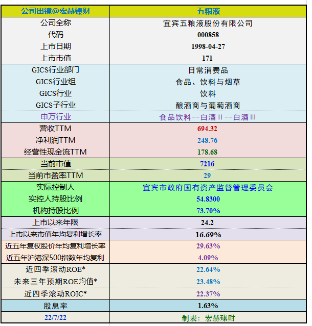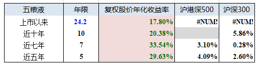 五粮液 自上市以来市值由171亿走至当前的7216亿,公司上市以来,近十年、七年、五年的复权股价年化收益率与指数对照如下表: