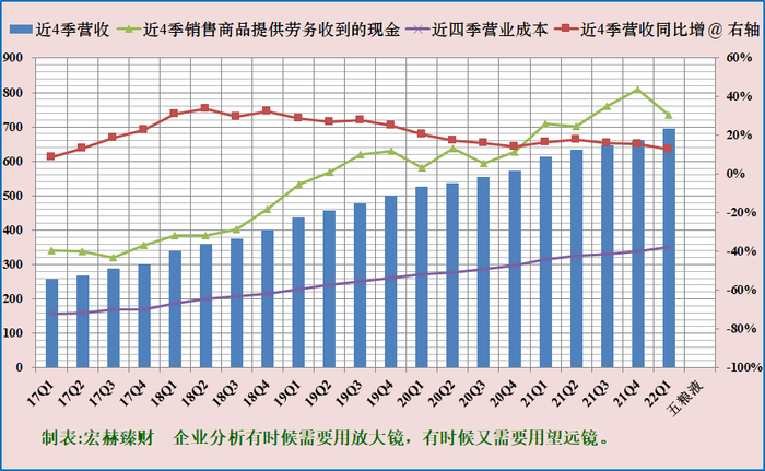 绿色折线接近或高于蓝色柱图上边显示营业收入含金量高。