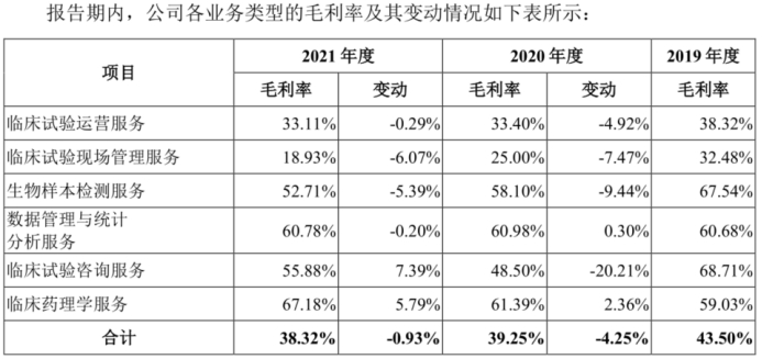 同时,公司临床实验运营服务、临床试验现场管理服务、生物样本检测服务等主要业务的毛利率,更是连年较大幅度下滑,使得公司整体毛利率由2019年的43.5%连续跌至2021年的38.32%。