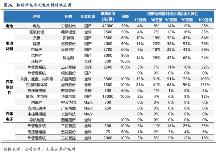 而三电系统(电池、电机、电控)是电动车较燃油车最具差异性的零部件环节之一,在电动车中具有较高的技术壁垒。研发实力强、规模优势较大的电池、电池材料、热管理系统、电驱动系统龙头企业,一旦进入特斯拉供应链,也将获得较大的成长空间和产品溢价。