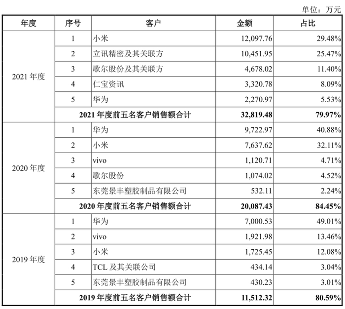 与此同时,公司2019-2021年主要客户为小米、立讯精密、仁宝资讯、华为和维沃等,来自前五大客户的销售收入占当期营业收入的比重分别为80.59%、84.45%和79.97%,客户集中度较高。