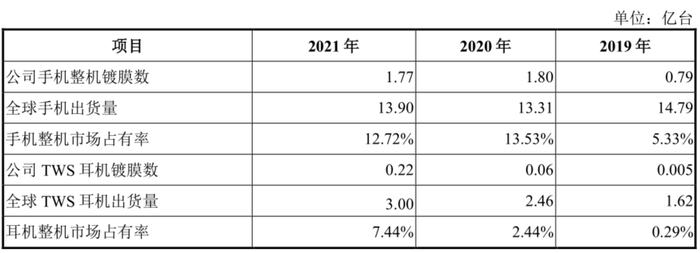 2019-2021年,公司手机整机镀膜数分贝为0.79亿台、1.8亿台和1.77亿台,对应手机整机市场占有率分别为5.33%、13.53%和12.72%;TWS耳机镀膜数分别为50万台、600万台和2200万台,对应耳机整机市场占有率分别为0.29%、2.44%、7.44%。