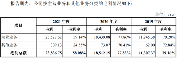 一增一减之间,公司整体毛利率由2019年的79.16%降至2020年的77.83%后,于2021年再度大幅下滑至58.08%。