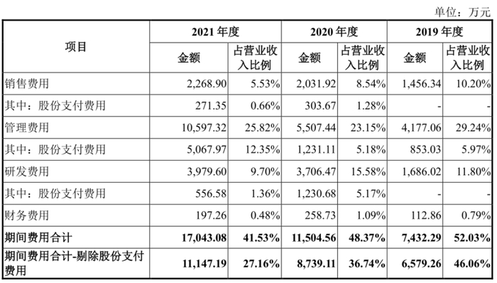 招股资料显示,公司2019-2021年销售费用率分别10.2%、8.54%、5.53%,研发费用率分别为11.8%、15.58%、9.7%,整体均呈现下行趋势,带动公司整体费用率由2019年52.03%下降至2020年的48.37%,于2021年进一步大幅降至41.53%。