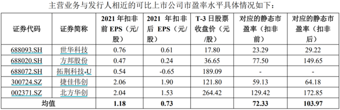 目前,公司已确定18.54元/股的发行价格,对应的公司2021年扣除非经常性损益前后孰低的摊薄后市盈率为174.61倍。无论是对应截至2022年7月19日(T-3日),中证指数发布的“计算机、通信和其他电子设备制造业(C39)”最近一个月27.60倍的平均静态市盈率;还是对应主营业务相近的可比上市公司103.97倍扣非后静态市盈率而言,菲沃泰都要高出不少。