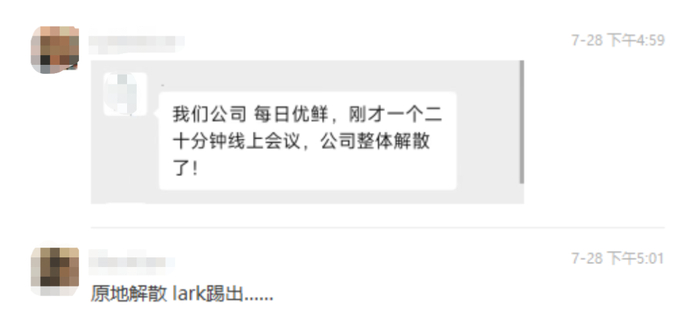 一位每日优鲜的技术岗员工对第一财经记者表示,7月28日下午公司用飞书拉了语音会议通知后,没有给员工反应时间就停用了飞书邮箱账号。而在下午的会议中,公司高层都没有出席,仅有公司财务和人力负责人出面表示公司没有收到之前2亿元的投资到账款,而公司账上没有多余的钱。同时员工没有收到离职赔偿以及工资。