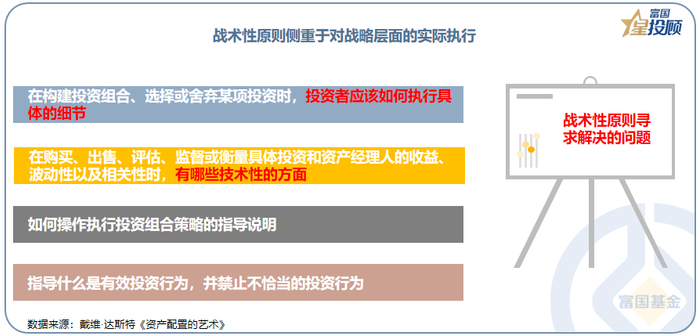 战术性资产配置侧重于对战略的灵活执行,对短期的波动更为敏感:在回应市场短期波动时,一般最好从战术层面来处理。在具体执行层面,会依据金融市场的实际情况,在不跳脱大的战略性原则下,选择资产配置比例和具体种类。
