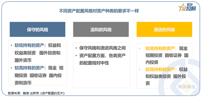 (2)您的投资风格是?斯特认为,我们很难将某一特定资产或投资者的性格在所有的市场环境下严格地界定为保守、温和或激进的,但至少可以做一个相对合理的风格选择。保守的资产配置风格应该表现出较低的资产价格波动,温和型、激进型的资产价格波动性依次递进,由此对各类资产的要求也不一样。