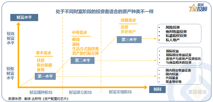 (1)您处于财富哪个阶段?当投资者处于不同的财富阶段时,他们需求和关心的焦点也会不同,与之相适应的资产种类也会发生变化。达斯特将财富渐变的过程分为3个阶段:财富播种阶段、财富建立阶段、财富实现阶段(如下图)。