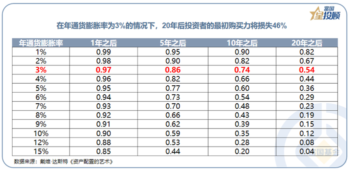 (1)对接客观的投资诉求。跑赢通胀是一个基本的底线要求:一个简单的例子,假定一项投资的本金价值保持不变,在年通货膨胀率为3%的情况下,20年后投资者的最初购买力将损失46%。换句话说,投资者需要资产的价值相比最初增长1.85倍才能维持与最初相等的购买力。