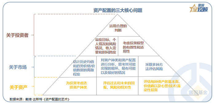 (1)资产配置的三大核心问题:问题1:资产如何运行?评估各类资产的回报、风险和相关性,为投资者考虑选择资产种类。问题2:市场的驱动逻辑?分析股票、债券、商品的驱动逻辑;评估各类资产出现最好、最坏、以及最有可能的情况。问题3:投资者如何选择?结合自身情况确立目标和预算约束