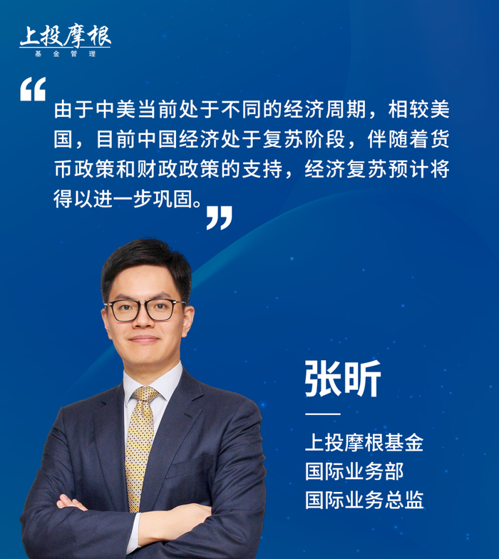 张昕 基于上投摩根的宏观分析,我们预计下半年中国股市走出独立行情的概率较大。由于中美当前处于不同的经济周期,相较美国,目前中国经济处于复苏阶段,伴随着货币政策和财政政策的支持,经济复苏预计将得以进一步巩固。反观美国,目前处于经济周期的中后期,在美国失业率较低的背景下,美联储仍可采取相对鹰派的加息政策,以应对其国内的高通胀。