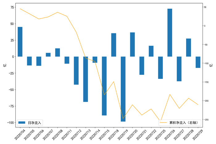 2022年7月20个交易日中,北向资金共8天为净流入,12天为净流出。其中单日最大净流入为7月26日的72.57亿,单日最大净流出为7月19日的98.59亿。