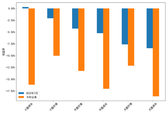2022年7月巨潮风格指数中,小盘成长表现最好,收益率为0.32%,而大盘成长表现最差,收益率为-8.44%;今年以来,小盘价值表现最好,收益率为-10.03%,大盘成长表现最差,收益率为-18.63%。