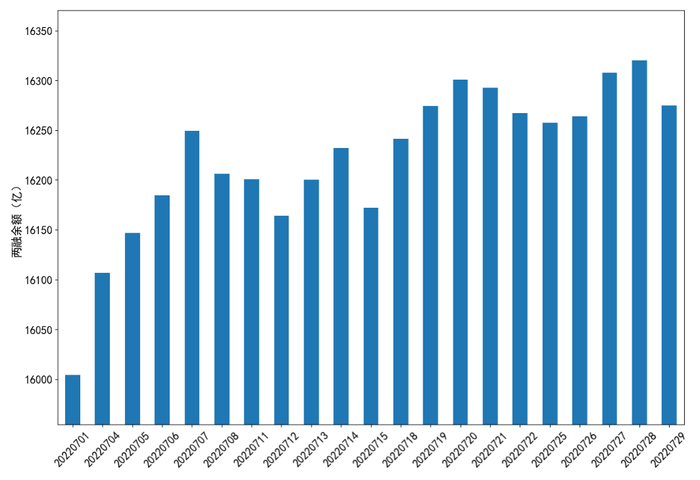 2022年7月两融余额总体呈现上升趋势,月末相比月初增加了270.25亿。
