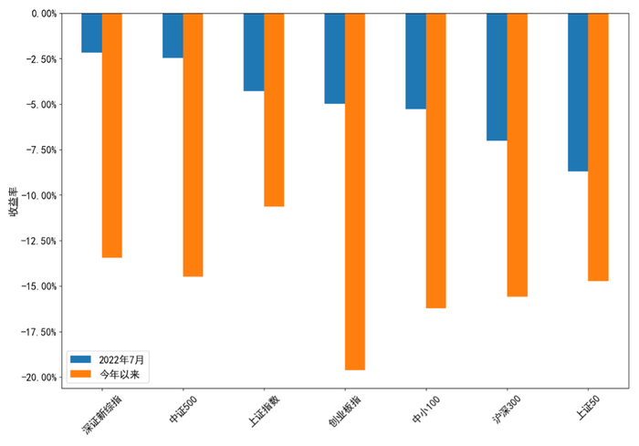 2022年7月主要市场指数中,深证新综指表现最好,收益率为-2.18%;上证50表现最差,收益率为-8.70%。