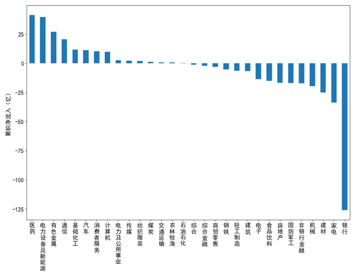 分行业来看,30个中信一级行业中,上月共15个行业净流入,15个行业净流出。其中医药净流入最多,净流入41.38亿;银行净流出最多,净流出125.91亿。