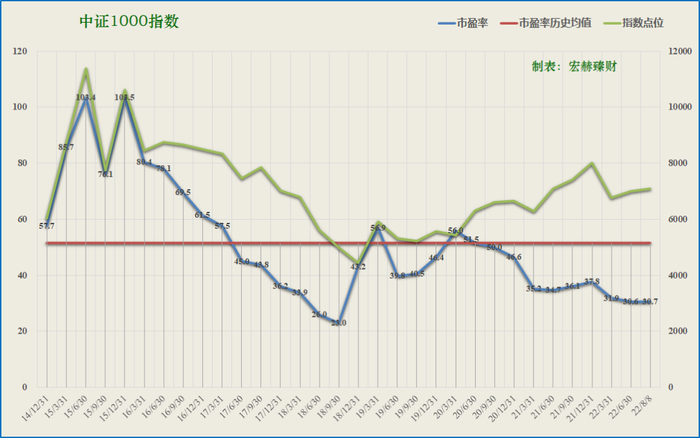 市盈率:中证1000指数自2014/12/31日统计以来历史季度市盈率均值51.5倍,最大值为最2015年4季度103.5倍;最小值为2018年3季度的23.0倍。当前值30.7倍,处于历史区间的百分位:【9%】