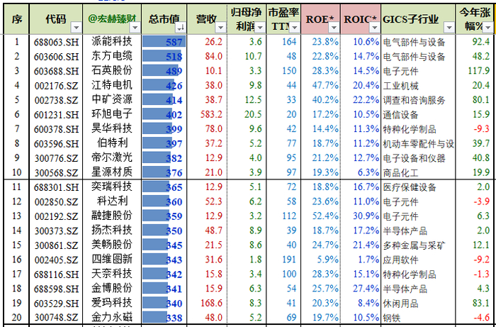 ♢当前最大市值:587亿;Top20门槛:338亿人民币