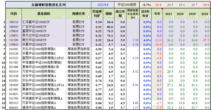 据宏赫臻财统计,截止2022年08月08日,市场上跟踪中证1000指数的指数基金共40只。
