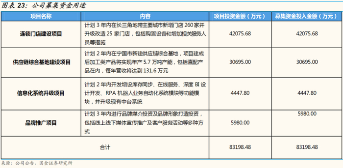 公司预计募资8.3亿元,50.6%用于江浙沪皖门店扩张升级,计划3年内在长三角地带主要城市新增门店260家并升级改造25 家门店;36.9%用于供应链综合基地建设项目,计划2年内在宁国市新建供应链综合基地,项目建成后加工类产品将实现年产5.7万吨产能,每年营收将达到131.6万元;其余资金用于信息化系统升级和品牌推广。