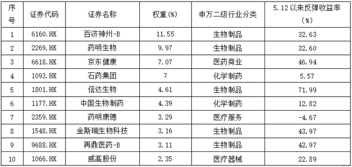 (2)从指数成份股来看,中证港股通医药卫生综合指数目前共83个成份股,其中前十大成份股占比合计达56.5%,持仓较为集中,聚焦细分赛道龙头企业,涵盖5个申万二级行业,分别为生物制品、化学制药、医疗服务、医疗器械、医药商业行业。