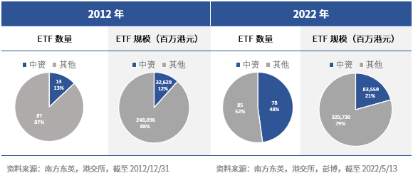 历经十年,香港ETF市场发展迅速,中资管理人的市场地位逐步上升。中资管理的ETF数量和资产管理规模分别增长了500%和156%,逐渐形成与外资旗鼓相当的竞争格局。从ETF市场成交额角度来看,2012年只有两只中资ETF打入日均成交额前十榜单;而2022年初至今,香港成交额排名前十的ETF中有七只是由中资管理的,其中南方东英独占六个席位。
