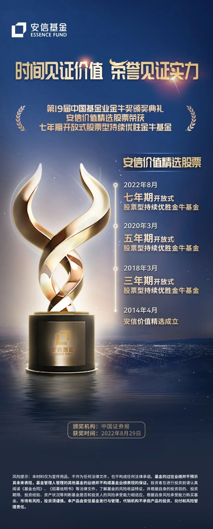 第十九届中国基金业金牛奖颁奖典礼圆满举办,安信基金的旗舰股基安信价值精选,荣获七年期开放式股票型持续优胜金牛基金。这是继2018年3月获三年期金牛奖、2020年3月获五年期金牛奖后,陈一峰管理的安信价值精选再次获得长期金牛奖项。