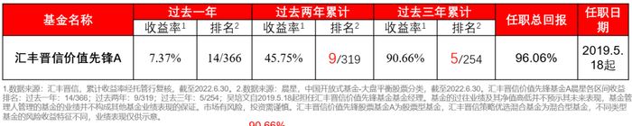 吴培文的代表作——汇丰晋信价值先锋,自2019年5月18日管理至今,任职回报96.06%。过去一年、过去两年、过去三年累计收益率分别是7.37%、45.75%、90.66%,同类排名14/366、9/319(前3%)、2/254(前2%)。(数据来源:汇丰晋信,累计收益率经托管行复核,截至2022.6.30。晨星,中国开放式基金-大盘平衡股票分类,截至2022.6.30)