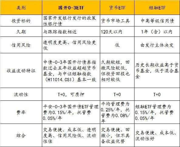 目前场内现金管理产品以货币ETF和短融ETF为主,那么国开0-3ETF的优势在哪里,相比其他短期理财工具有何异同呢?