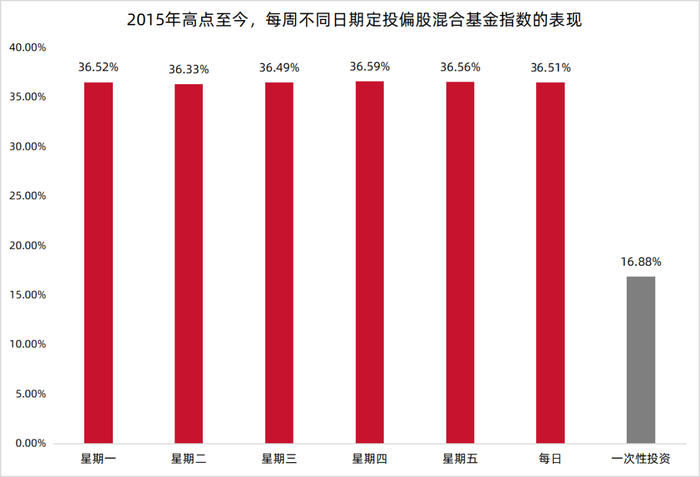 答案不言而喻:2015年6月12日至今,首先是定投的持有体验明显好于一次性投资;其次是每周几定投的长期差距甚微,我们完全不必太纠结。