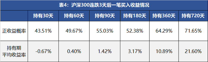 短期来看,连跌3天之后买入,持有一到两个月,正收益的概率并未超过50%,但是,随着持有时间的增加,正收益概率和持有期平均收益也是在不断提升。