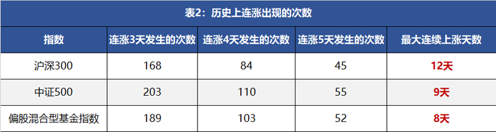 连续上涨的情况也很类似,不过中证500连续上涨的次数明显多于沪深300和偏股混合型基金指数,大家过去印象中的“中小盘风格”上涨爆发力比较强,从这个角度也是得到了一定的印证。