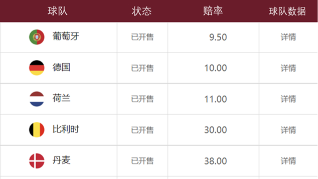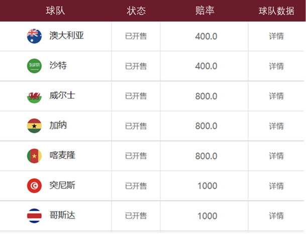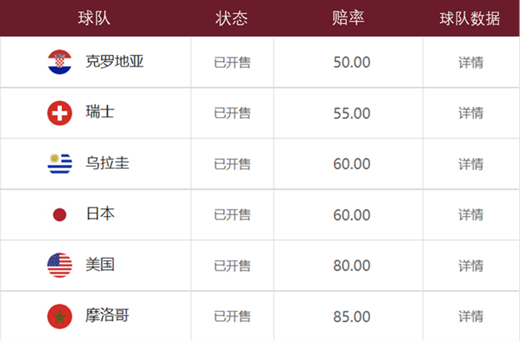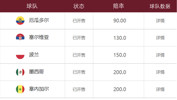 注:赔率代表在该队最终夺冠的情况下,下注人将获得相应赔率倍数的赔付金额。数据来源:中国体育彩票,截至2022年11月29日。上述举例阐述不构成投资建议,不代表对实际投资收益的预测、保证。