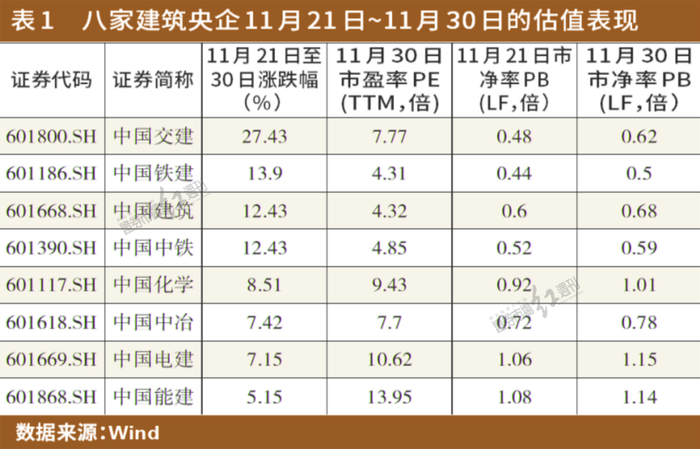 11月21日,易会满主席提出了要“探索建立具有中国特色的估值体系”,此观点一经提出,低估值的八大建筑央企迎来一波反弹行情(见表1)。
