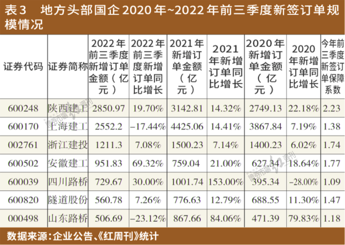 当然,相较央企龙头的新签订单保障系数,地方头部国有基建企业同样也不逊色,譬如目前陕西建工新签订单保障系数居高,截至第三季度该项指标为2.23(见表2、表3、表4)。