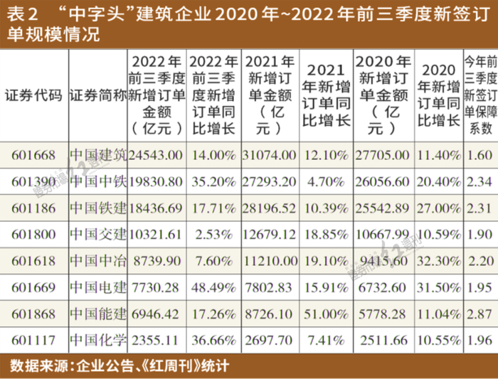 整体上,八大建筑央企在手订单饱满度都较高,新签合同额大多保持双位数增长。从新签订单保障系数(新签订单与营收比值)看,大市值建筑央企的业绩支撑能力更强。《红周刊》测算,截至三季度,“八大建筑央企”新签订单保障系数均高于1,中国能建、中国中冶、中国中铁、中国铁建4家企业订单保障系数甚至高于2。