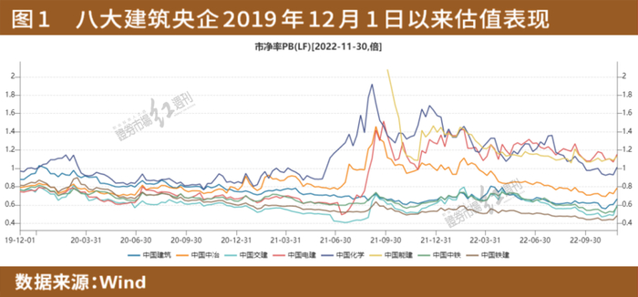 近几年来,因消费和出口走强,基建板块在“三驾马车”中的作用一度被弱化,这让与之相关的产业和公司也未能体现出应有的价值。譬如,八大建筑央企的估值就长期处于较低位置。数据显示,2019年12月1日至今,几大基建央企曾出现过集体破净情况(中国能建除外,其于2021年9月28日上市),而即便是上市较晚的中国能建,市净率也从2倍多一路降至目前的1.14倍左右(见图1)。