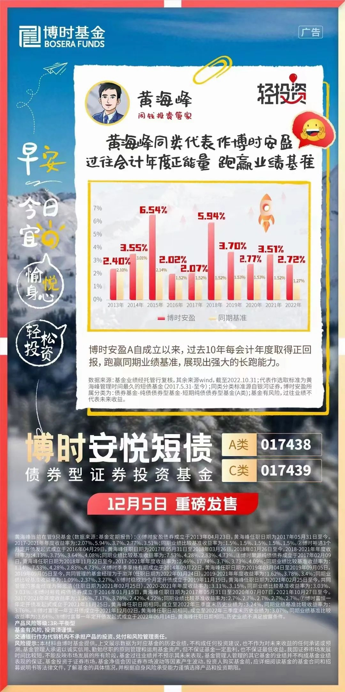 踏入真净值时代,面对投资难度加大,理财产品应该如何买?随着2022年震荡市步入尾声,博时基金主张“轻·投资”,从低风险产品入手,缓解投资焦虑,中长期耐心积累收益,在不经意间收获沉淀的“果实”——12月5日至23日期间,博时安悦短债债券型证券投资基金(A类:017438;C类:017439)正式上线发售。