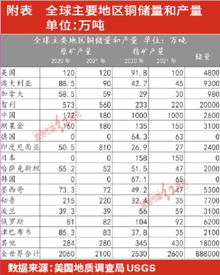 全球铜资源主要分布在南美洲的智利和秘鲁等地区(见附表)。随着铜资源的开采,剩余资源的稀缺性逐渐增强,铜矿石品位下降制约铜矿产量。从1990年至今,全球铜矿山平均品位由1.6%下降到1%左右,而全球最大铜矿生产国智利铜矿石品位下降情况尤为突出。