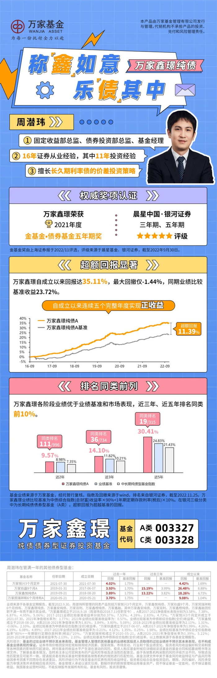 周潜玮:万家鑫璟投资策略是信用债加利率债投资组合,信用债部分是以3A等级的信用债为主,利率债部分以10年期的证金债为主。产品的组合久期会在1.5~5年之间波动,主要还是利率债部分仓位的增减带来组合的变动。万家鑫璟收益不错,主要得益于利率债波段做的相对比较成功。