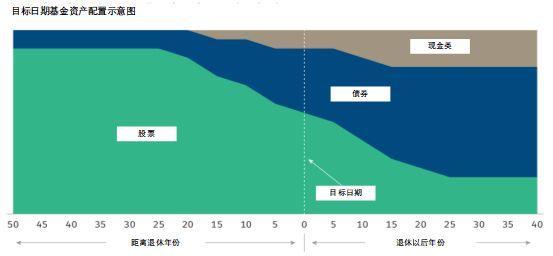 目标日期基金采用长期滚动配置策略,配置的股票债券和现金类资产比例,根据距离目标日期的时间自动调整(见下图)。一般来说,在产品启动初期,距离目标日期时间较长,配置的股票比例较高,以获取股票的长期收益。随着距离目标日期越近,股票配置比例越低、债券配置比例越高。达到目标日期后,该类产品就转为稳健平衡,债券配置比例更高,股票比例更低,辅以部分现金类资产,以保证产品支付能力。股票配置比例的变化一般称为“下滑路径”。