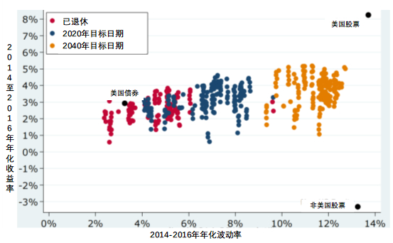 下图是德勤的一项研究,目标日期基金的收益率和波动率,不同到期时间的产品有不同的水平。相对远期到期的目标日期基金(如2040目标日期),其波动率明显比近期到期的产品要高(2020到期),但年化收益率也相对要高。而已进入退休支付阶段的目标日期基金,波动率明显较低,同时收益水平也较低。