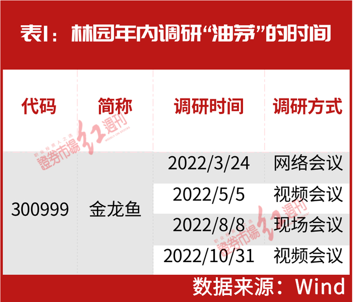 尽管市场对此仍有疑问,但从今年以来林园的一系列举动来看,或正如其公开发言所讲,并没有真的退出这些他一直看好的公司,今年以来林园已先后四次对“油茅”发起调研(见表1)。